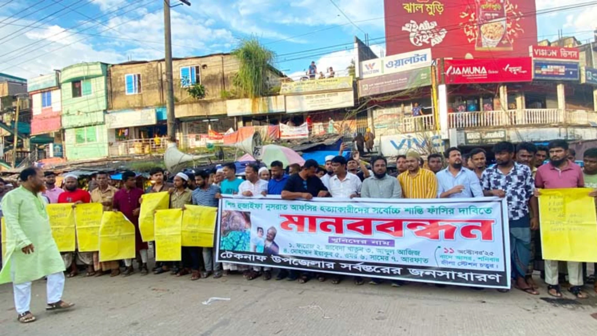 মানববন্ধনে নিহত শরীফার পরিবার, স্থানীয় রাজনৈতিক ও সামাজিক সংগঠনের নেতারা বক্তব্য দেন। বক্তব্যে তাঁরা হত্যাকাণ্ডে জড়িত সব আসামিকে দ্রুত গ্রেপ্তার ও দৃষ্টান্তমূলক শাস্তি দেওয়ার দাবি জানান।